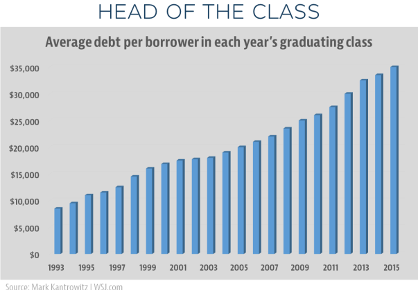 As a result, student loan debt continues to climb at a steady rate. (Outpacing even credit card debt!):